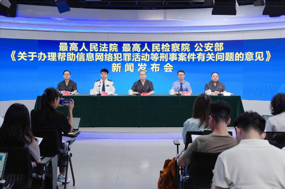 2025年7月28日,最高人民法院、最高人民检察院、公安部联合召开新闻发布会,发布《关于办理帮助信息网络犯罪活动等刑事案件有关问题的意见》、依法惩治帮助信息网络犯罪活动及相关犯罪典型案例,并回答记者提问。最高人民法院刑三庭庭长汪斌,最高人民法院刑三庭副庭长王鲁,最高人民检察院经济犯罪检察厅副厅长张建忠,公安部刑侦局副局长郑翔出席发布会,发布会由最高人民法院新闻局副局长姬忠彪主持。发布会上,最高人民法院刑三庭庭长汪斌发布了《关于办理帮助信息网络犯罪活动等刑事案件有关问题的意见》。