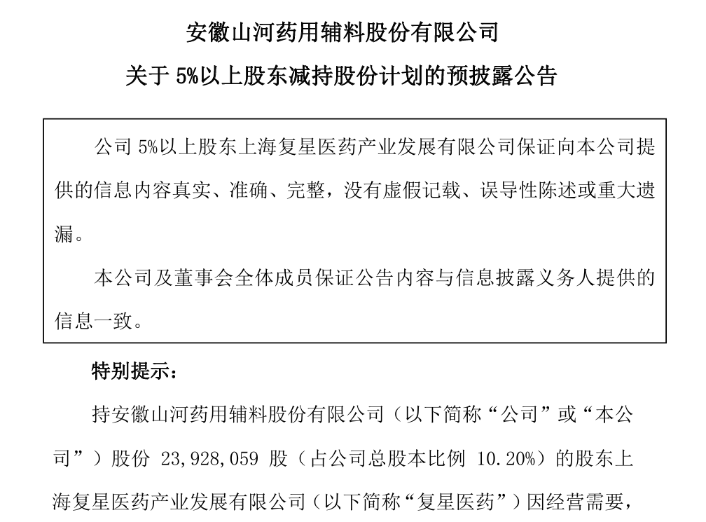 2月23日晚间,山河药辅(深市代码:300452)发布公告称,公司第二大股东上海复星医药产业发展有限公司(以下简称“复星医药”)因经营需要,计划减持不超过697.8万股,占公司总股本的3%。此次减持计划的时间窗口为2025年3月18日至6月15日,减持价格将根据市场价格及相关规定确定,且不低于发行价。
