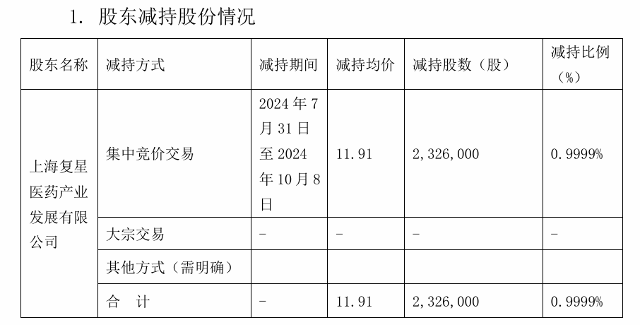 值得注意的是,这并非复星医药首次减持山河药辅股份。根据山河药辅此前公告,2024年7月31日至2024年10月8日期间,复星医药已完成减持232.6万股,减持均价为11.91元/股,套现金额约2770.27万元。