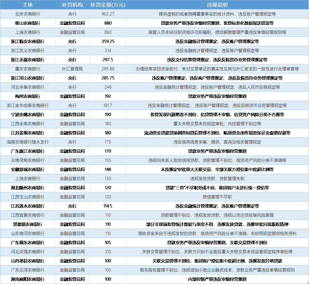 此外,今年一季度罚单中,暴露出部分农商银行存在股东股权管理缺陷、员工行为失范、数据造假与监管报送违规等问题。广东云浮农商银行因“股东股权管理不到位”等被罚100万元;大兴安岭农商银行因同样原因被罚20万元。江西赣县农商银行因“内部制度不完善,员工行为管理不到位”被罚40万元;云南迪庆农商银行员工挪用贷款资金被罚35万元。佛山农商银行880万元罚单中包含“监管标准化数据报送错误”;青海化隆农商银行因“非现场监管数据不准确”被罚30万元。