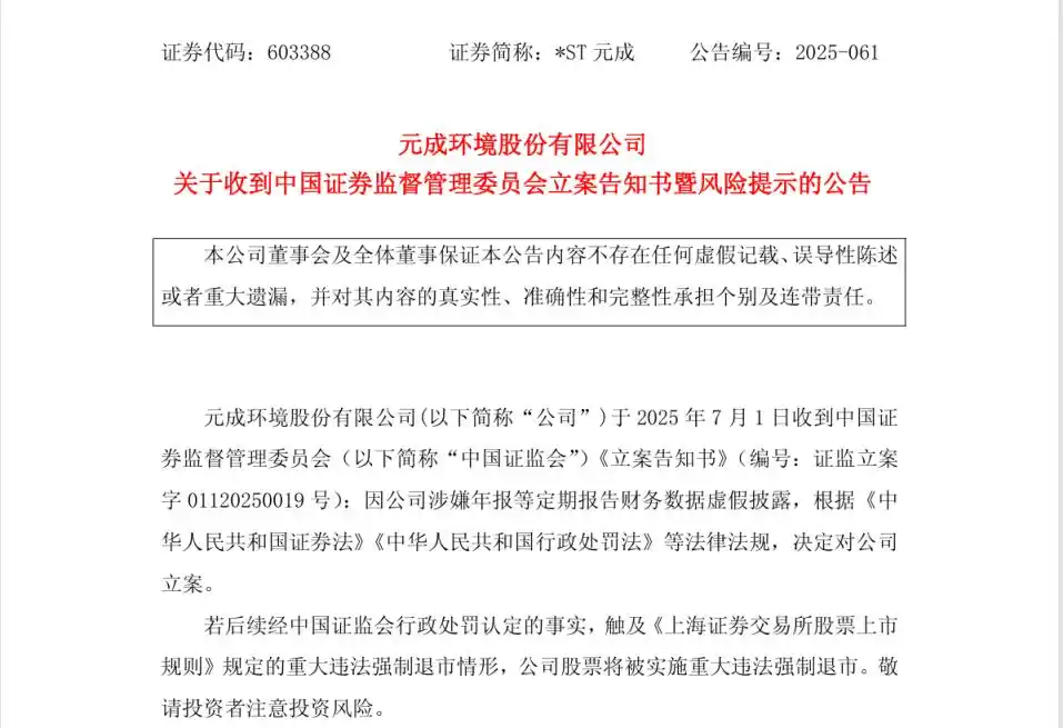 元成环境股份有限公司涉嫌财务数据造假被证监会立案