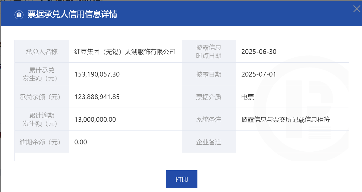 红豆集团(无锡)太湖服饰有限公司现承兑逾期,2025上半年逾期达1300万