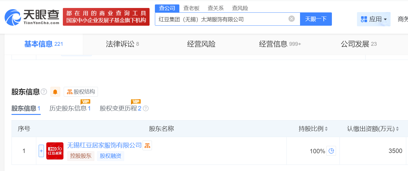 天眼查数据显示,红豆集团(无锡)太湖服饰有限公司成立于2004年,系红豆集团成员企业,坐落于江苏省无锡市,专注于纺织服装、服饰业领域。企业注册资本为3500万人民币。股权结构上,由无锡红豆居家服饰有限公司 100% 控股,其认缴出资额与注册资本一致。