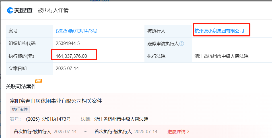近日,通过天眼查司法案件显示,7月14日,杭州张小泉集团有限公司、张樟生、张国标等新增一条被执行人信息,执行标的1.61亿余元,执行法院为浙江省杭州市中级人民法院。