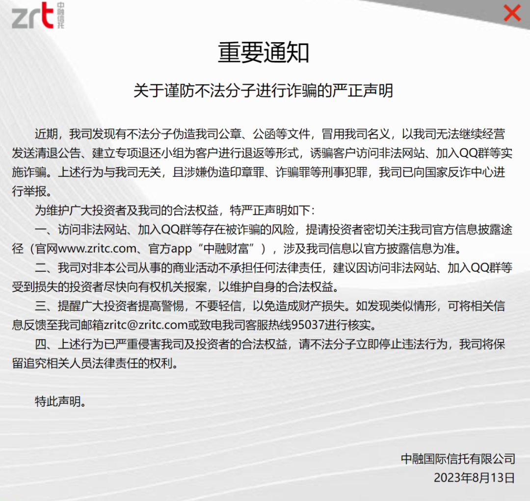 8月14日,中融信托官网发布通知,近期,我司发现有不法分子伪造我司公章、公函等文件,冒用我司名义,以我司无法继续经营发送清退公告、建立专项退还小组为客户进行退返等形式,诱骗客户访问非法网站、加入QQ群等实施诈骗。