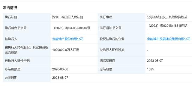 8月22日,据天眼查显示,8月7日宝能地产股份有限公司新增了一则股权冻结信息被冻结了100亿元股权,股权被执行企业为宝能城市发展建设集团有限公司,冻结期至2026年8月6日,执行法院为深圳市福田区人民法院。