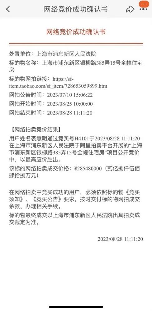 根据网络竞价成功确认书显示,用户裘慧明通过竞买号H4101于08月28日 11点11分在上海市浦东新区人民法院于阿里拍卖平台开展的“上海市浦东新区银柳路385弄15号全幢住宅房”项目公开竞价中,以最高应价胜出。拍下这栋豪宅的用户显示姓名为裘慧明。