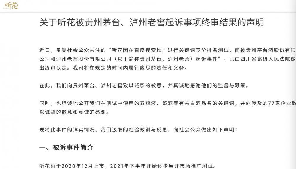 8月27日,听花酒业在官网披露,近日收到四川省高级人民法院的终审民事判决,判决认定需向贵州茅台、泸州老窖分别赔偿30万元和20万元,听花酒表示将在规定时间内履行应尽的责任和义务。
