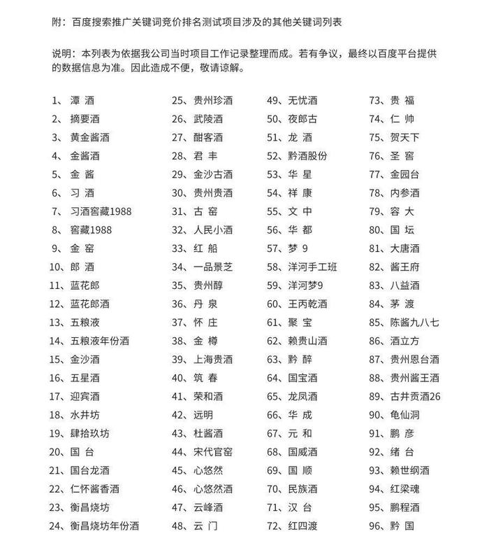 听花酒到底买了多少名酒的关键词呢?在声明中,听花倒也老实承认了,除了“茅台”和“国窖1573”外,听花酒一共买了77家酒企的96个产品名称作为关键词,在2021年9月14日至10月12日共28天内,在百度平台上测试了151个关键词,总费用为43543.43元,共获得点击量10533次。
