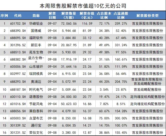 华峰铝业本周迎来上市三年的首发限售股解禁。根据公告,公司9月7日有7.21亿股首发限售股上市流通,占总股本比例的71.17%,是解禁前流通盘的约2.6倍,约合市值116.59亿元。解禁后公司实现全流通。