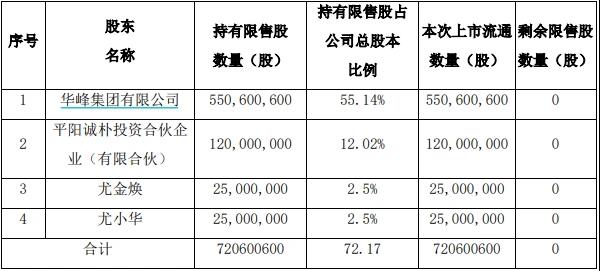 此次解禁涉及股东共四位,分别为第一大股东华峰集团有限公司、第二大股东平阳诚朴投资合伙企业(有限合伙)及自然人第四、五大股东尤金焕、尤小华。目前股东们暂未披露减持计划。