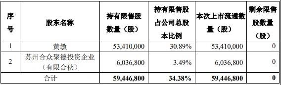 此次解禁包括实控人、董事长黄敏及苏州合众聚德投资企业。解禁筹码集中,压力有限。