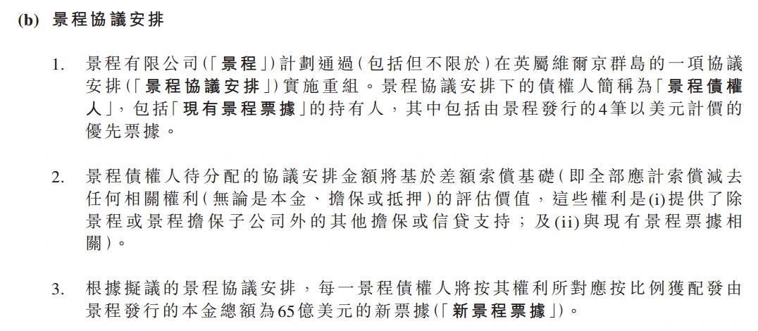 每一景程债权人将按其权利,按比例获配由景程发行本金总额65亿美元的新票据。