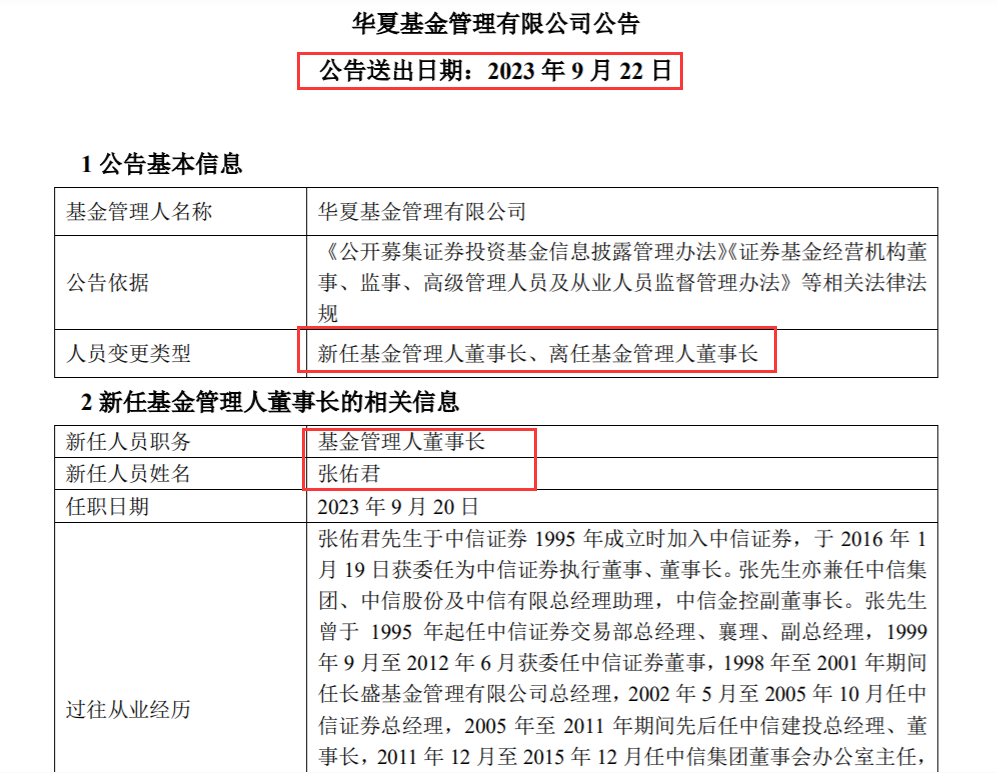 华夏基金表示,上述变更事项经第七届董事会2023年第十四次会议审议通过,将按相关法律法规的规定进行备案,并办理张佑君担任公司法定代表人的工商变更登记等相关事宜。同时,华夏基金对杨明辉担任董事长期间为公司发展所做出的重要贡献表示衷心感谢。