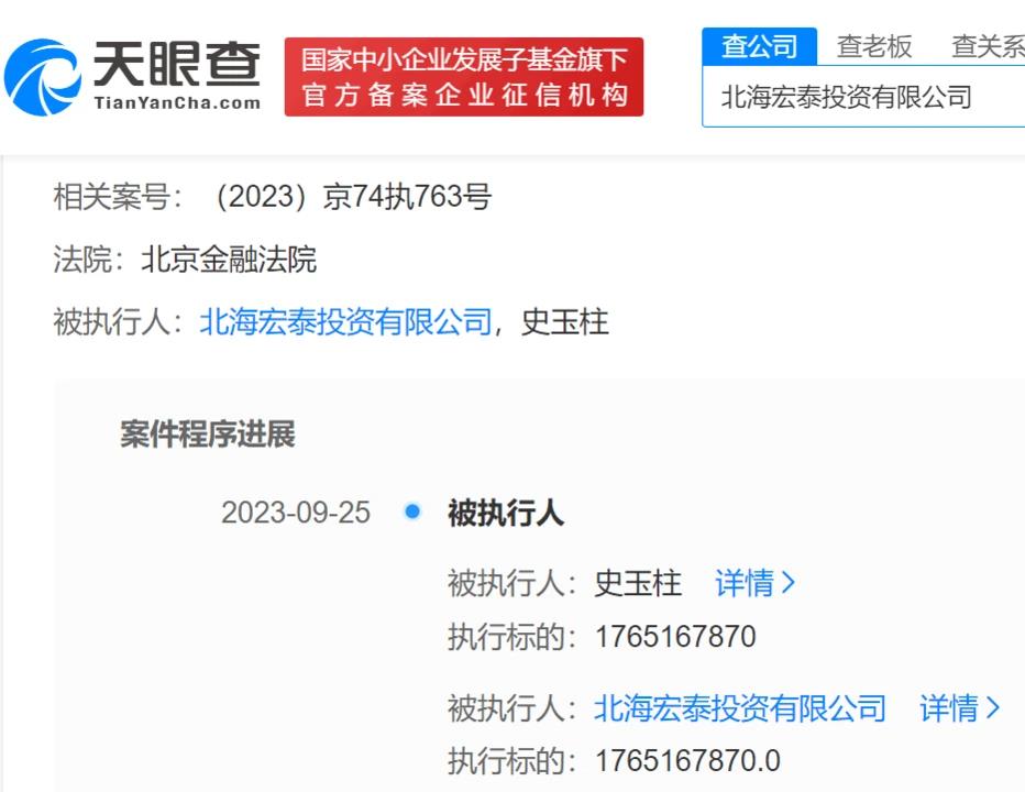 天眼查显示,近日,史玉柱、北海宏泰投资有限公司(下称“宏泰投资”)新增一则被执行人信息,执行标的17.6亿余元,执行法院为北京金融法院。