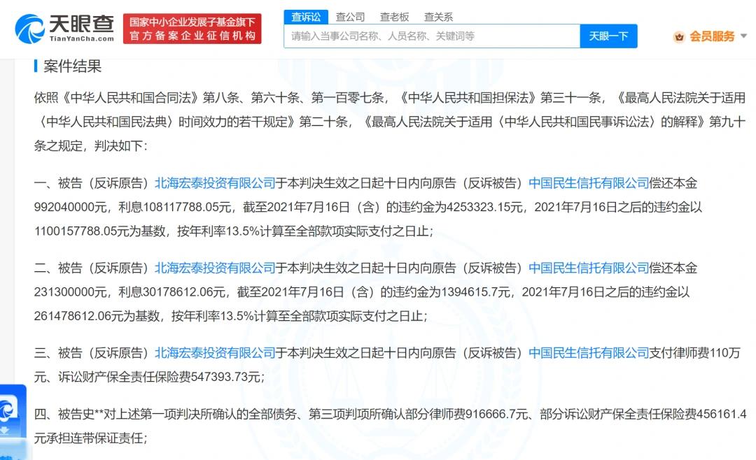 北京金融法院的第一项判决为,宏泰投资在判决生效之日起十日内,向中国民生信托有限公司(下称“民生信托”)偿还本金约9.92亿元,利息约1.08亿元。