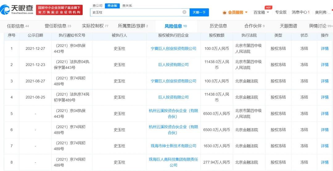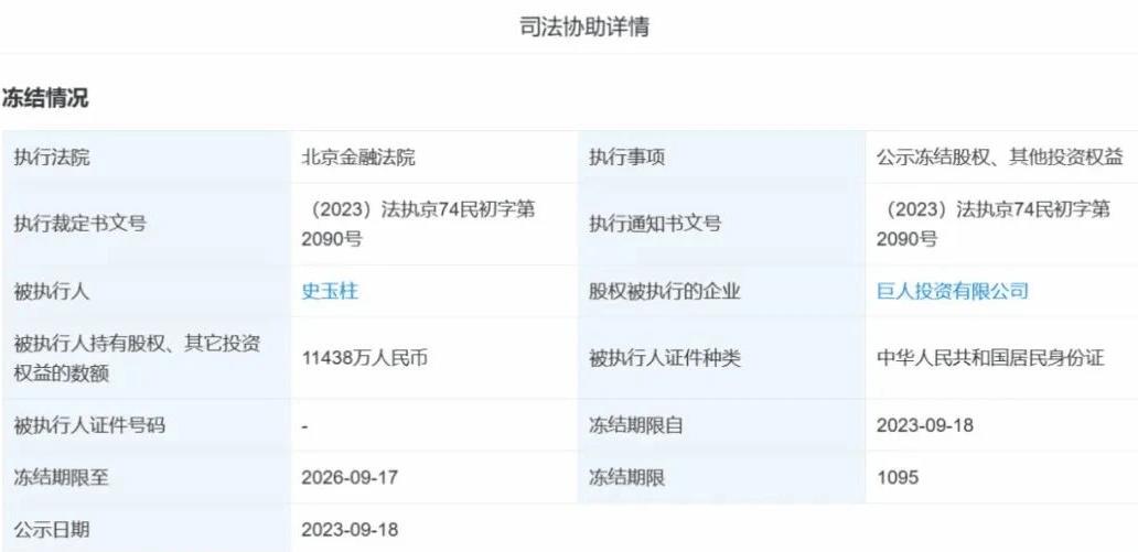 类似情况已有发生。9月18日,巨人投资有限公司(下称“巨人投资”)新增一则股权冻结信息,被执行人为史玉柱,冻结股权数额1.14亿元,执行法院为北京金融法院。