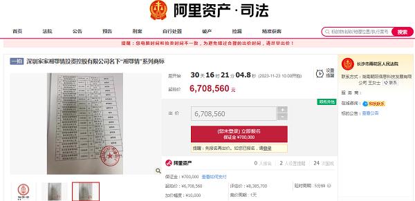 近日,在淘宝司法拍卖网上发现涉及多个商标类别总计35件“湘鄂情”系列商标被长沙市雨花区人民法院挂网拍卖,拍卖开始时间为11月23日,起拍价为6708560元。