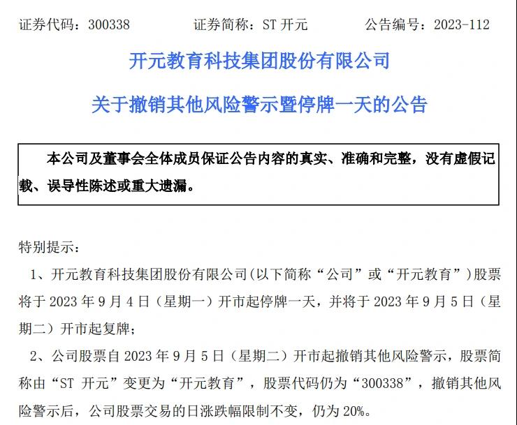 9月1日,开元教育公告,公司股票将于9月4日开市起停牌一天,并将于9月5日开市起复牌,并撤销其他风险警示,股票简称由“ST开元”变更为“开元教育”。