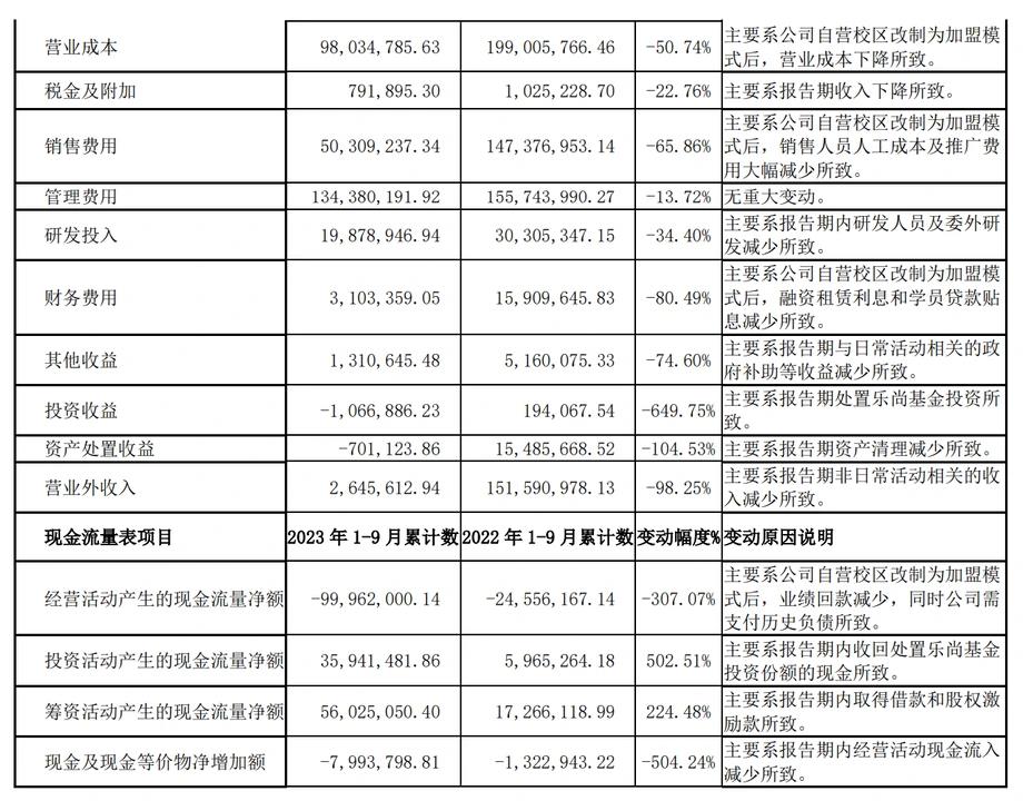 直到2023年4月24日,开元教育向深交所申请撤销公司股票交易其他风险警示。当时的公告中,开元教育称,公司已初步消除持续经营能力的重大不确定性。首先通过实行校区改制,公司成本费用较上年同期明显下降,净利润扭亏为盈。