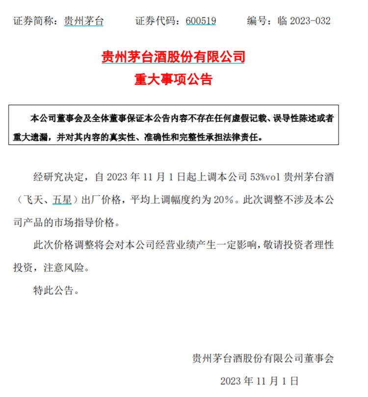 公告显示,经研究决定,自2023年11月1日起上调本公司53%vol贵州茅台酒(飞天、五星)出厂价格,平均上调幅度约为20%。此次调整不涉及本公司产品的市场指导价格。