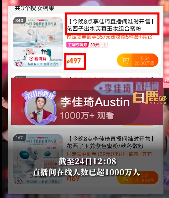 据报道,10月24日,在此前的79元眉笔事件风波后,李佳琦直播间时隔43天再次直播带货花西子,不过李佳琦本人并未出镜现身为此次花西子产品讲解带货。截至24日12:08,直播间在线人数已超1000万人。