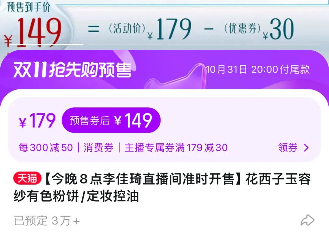 截至24日晚23时30分,花西子售价129元的蜜粉预定已超8万单,149元的粉饼预定超3万单,357元的组合套装预定超3000单,合计超过11万单。