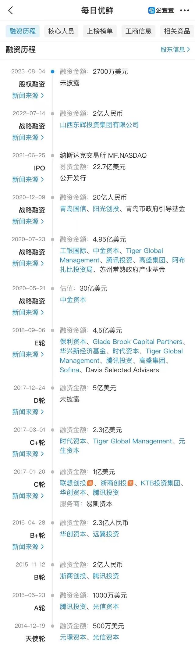 这一窘境在创办一年后被打破,凭借着首创的“前置仓模式”,每日优鲜获得多轮融资。据企查查数据显示,截至2023年8月4日,每日优鲜共获得过14轮融资,除其中一轮融资金额未披露,累计融资金额达318亿元人民币。(注:按照2023年12月5日当天汇率计算得出。)