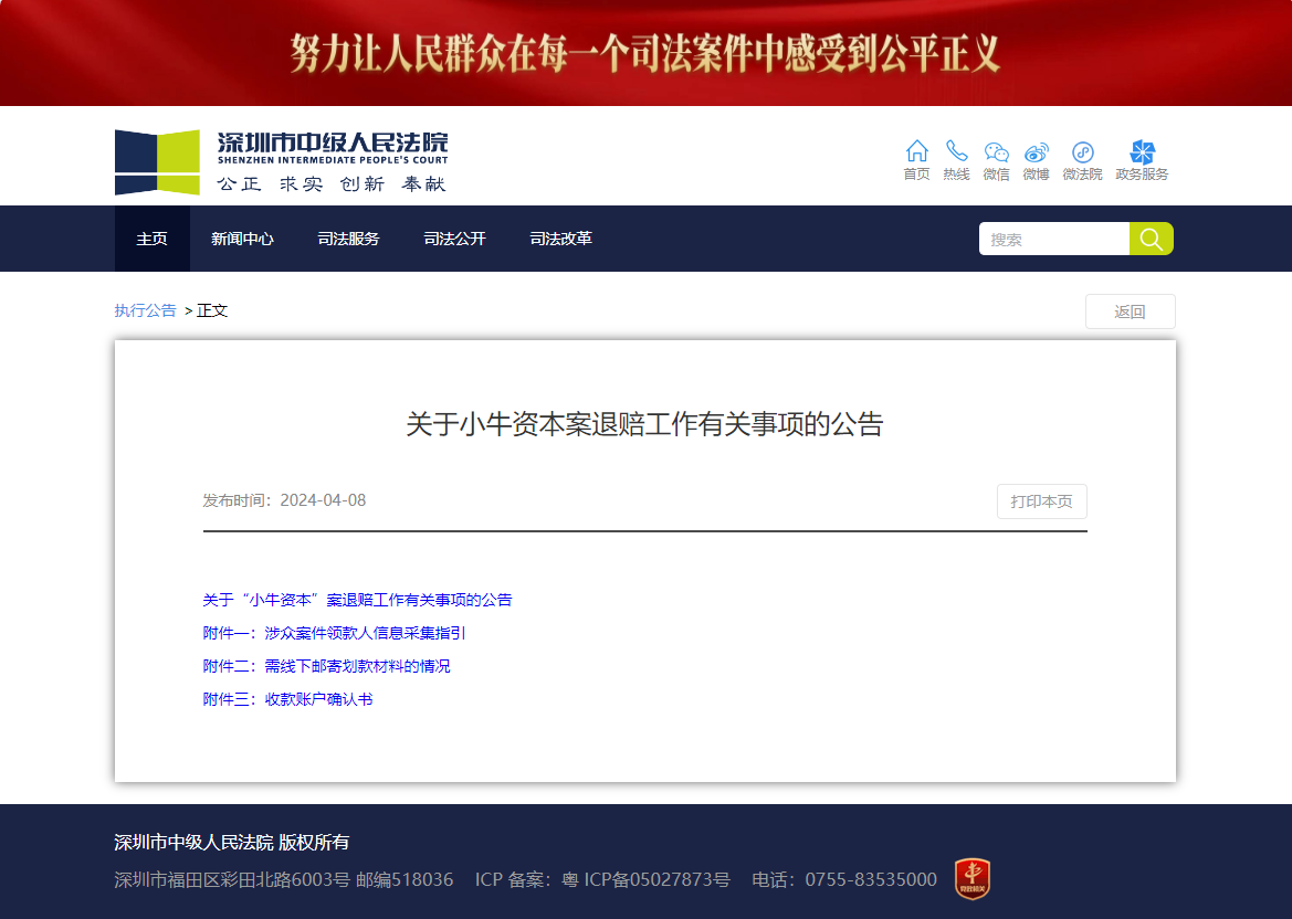 4月7日,深圳市中级人民法院官网发布了《关于“小牛资本”案退赔工作有关事项的公告》