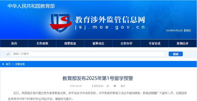 近日,美国俄亥俄州通过有关高等教育法案,其中包含涉华消极条款,对中美高校教育交流合作施加限制。教育部提醒广大留学人员,近期选择赴美有关州学习时做好安全风险评估,增强防范意识。
