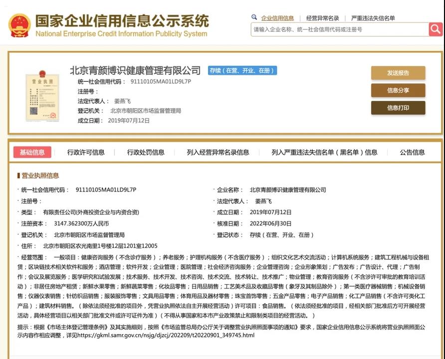天眼查网站显示,“五个女博士”所属公司为北京青颜博识健康管理有限公司。根据国家企业信用信息公示系统信息,该公司成立于2019年,法定代表人为姜燕飞,注册资本为3147.3623万人民币。经营范围包括:健康咨询服务(不含诊疗服务);养老服务;护理机构服务(不含医疗服务)等。