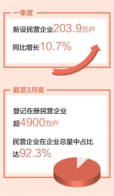 记者近日从国家市场监督管理总局获悉:一季度,全国新设民营企业203.9万户,同比增长10.7%。截至3月底,全国登记在册民营企业超过4900万户,民营企业在企业总量中的占比达到92.3%。