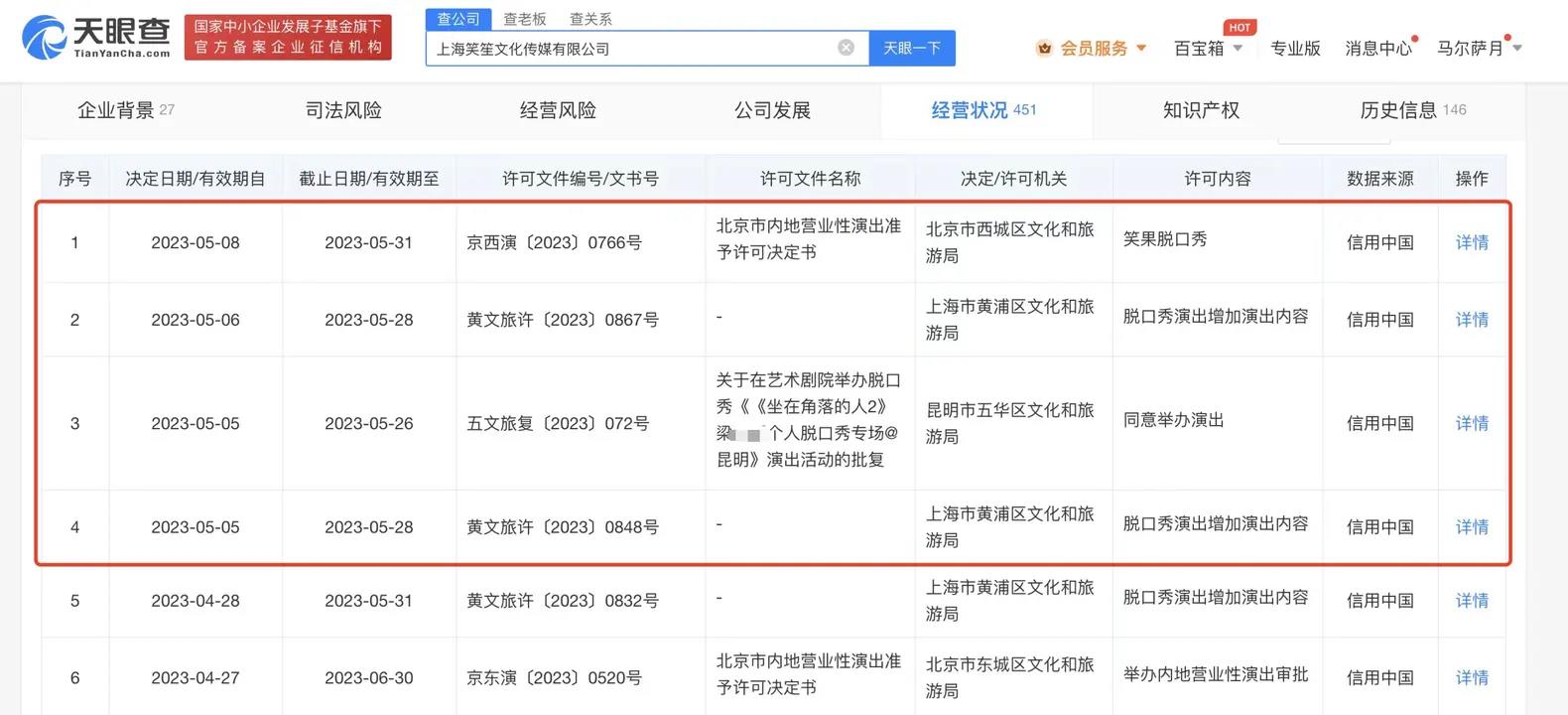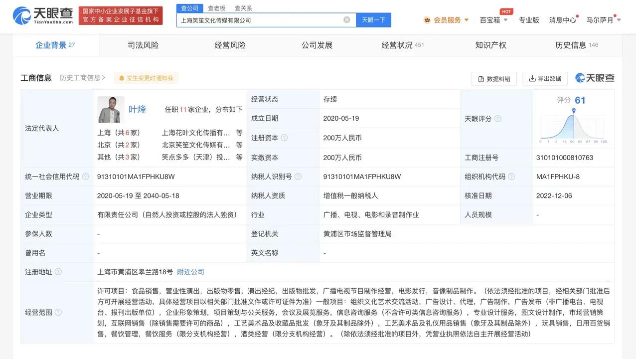 天眼查App显示,涉事上海笑笙文化传媒有限公司成立于2020年5月,法定代表人为叶烽,注册资本200万人民币,由上海笑果演艺集团有限公司全资持股。值得一提的是,今年5月,该公司刚获得多个行政许可,其中包括北京市内地营业性演出准予许可决定书。