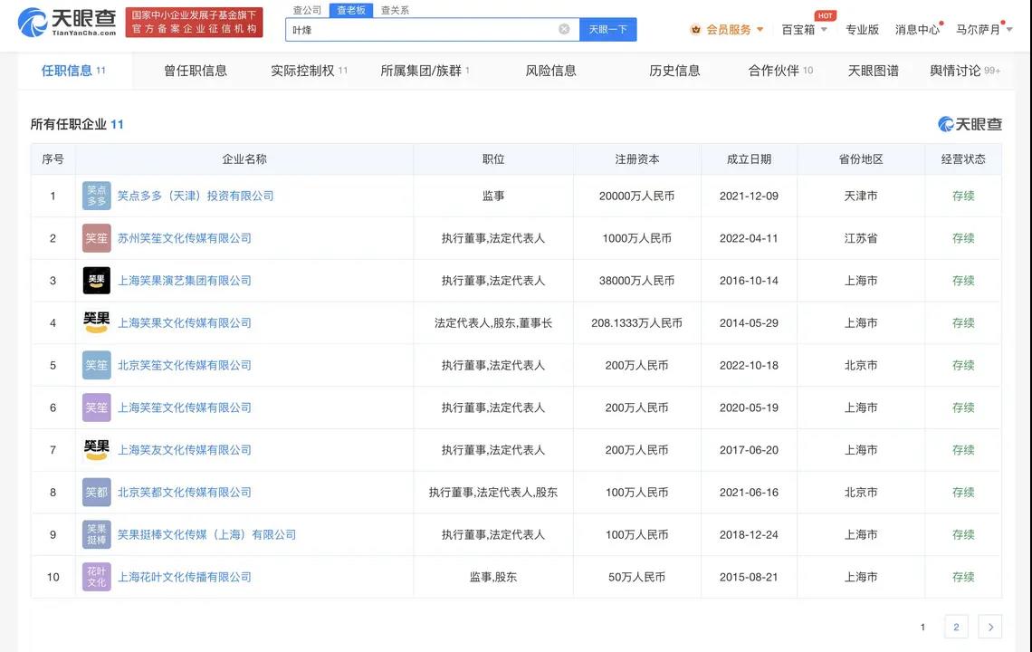 除上海笑笙文化传媒有限公司以外,上海笑果演艺集团有限公司对外投资企业还有6家,注册地址位于上海、深圳、海南。笑果创始人叶烽关联企业中10家为存续状态,包括上海笑果文化传媒有限公司、上海笑友文化传媒有限公司等,其中多数为笑果在各地的文化传媒公司。