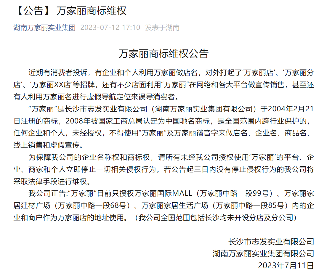 7月12日,湖南万家丽实业集团发布了一份商标维权公告,称部分平台、企商家和个人未经公司授权使用“万家丽”的行为属于侵权行为,责令他们三日内停止使用。