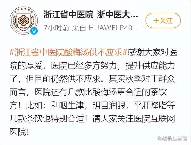 9月4日,浙江省中医院微信公众号连夜发文,称因为前来医院订购酸梅汤的订单实在太多,医院服务器已不堪重负。
