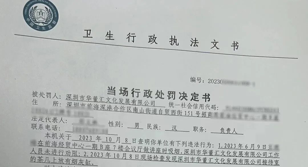 据介绍,10月8日,深圳市南山卫生监督所执法人员依据《深圳经济特区控制吸烟条例》第三十八条的规定,对深圳市华董汇文化发展有限公司作出警告的行政处罚决定,并下达卫生监督意见书,责令该公司立即改正违法行为。