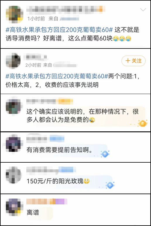 “水果收费也不是不能接受,就是价格太高了,阳光玫瑰现在一两百元一斤了吗?”