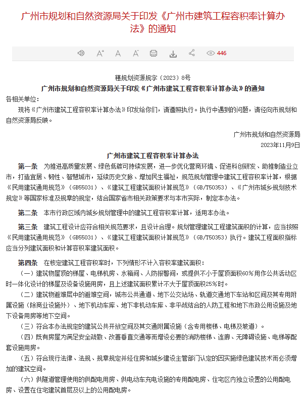 据介绍,2018年12月1日起广州实施的《广州市规划管理容积率指标计算办法》将于2023年11月30日届满。为进一步提高城市规划建设水平,规范规划管理中容积率建筑面积的计算标准,广州市规划和自然资源局对《广州市规划管理容积率指标计算办法》开展了修订工作,形成《广州市建筑工程容积率计算办法》(简称《容积率办法》),并于2023年11月9日正式发布实施。