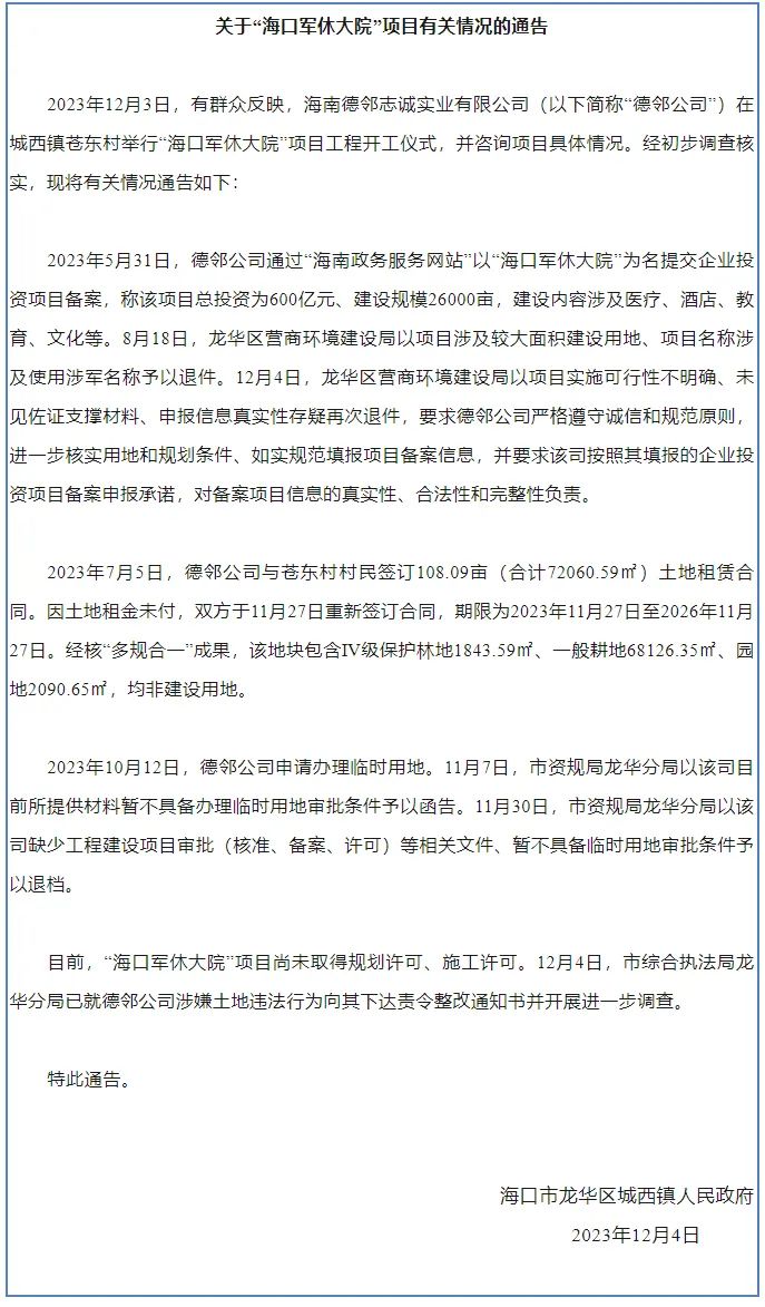 据海南省海口市龙华区委宣传部微信公众号“龙腾华彩”消息,海口市龙华区城西镇人民政府12月4日发布关于“海口军休大院”项目有关情况的通告: