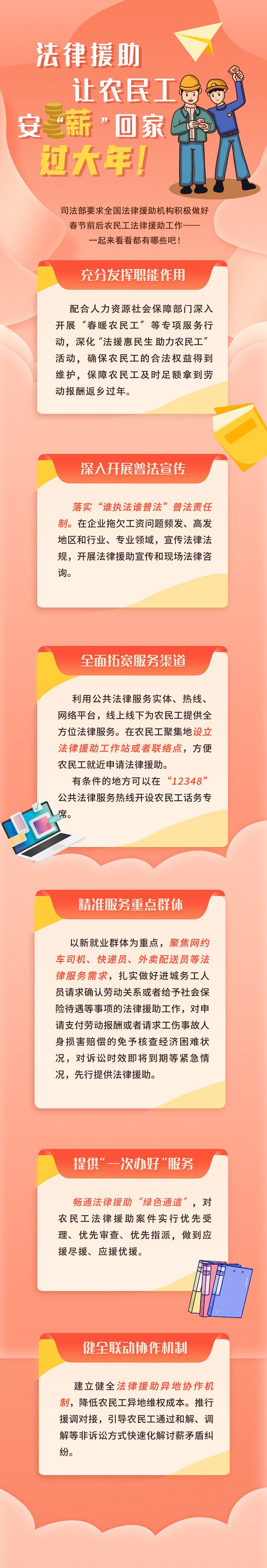 为做好春节前后农民工法律援助工作,司法部日前发出通知,要求全国法律援助机构为农民工提供“一次办好”法律援助服务,包括畅通法律援助“绿色通道”,对农民工法律援助案件实行优先受理、优先审查、优先指派,做到应援尽援、应援优援。