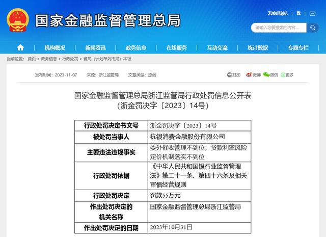 11月7日,国家金融监督管理总局浙江监管局发布公告,杭银消费金融股份有限公司(下称杭银消费金融)因委外催收管理不到位;贷款利率风险定价机制落实不到位被罚款55万元。