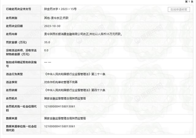 信用中国官网也于近日披露,国家金融监督管理总局陕西监管局10月30日对陕西长银消费金融有限公司(下称陕西长银消费金融)开具罚单。由于对合作机构催收管理不完善,陕西长银消费金融被责令改正,并处以罚款35万元。