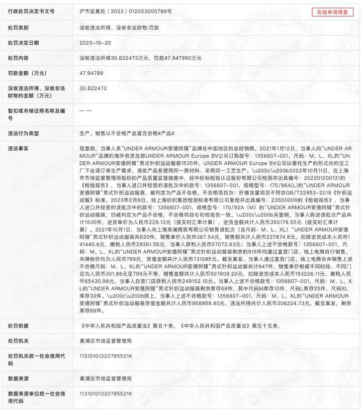 信用中国网站显示,10月20日,安德玛品牌关联公司安德阿镆贸易(上海)有限公司因“生产、销售以不合格产品冒充合格产品”,被上海市黄浦区市场监督管理局罚款47.9万余元、没收违法所得30.6余元。