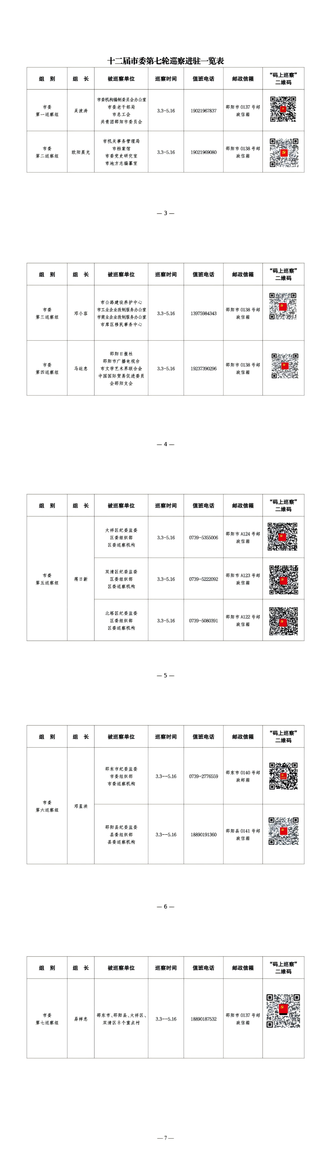 经市委批准,本轮巡察组建7个市委巡察组,对市委编办等16个市直单位开展常规巡察,同时配合省委巡视,对邵东市、邵阳县、大祥区、双清区、北塔区等5个县市区纪委监委机关、组织部门、巡察机构开展提级巡察,对邵东市、邵阳县、大祥区、双清区8个重点村开展提级巡察。