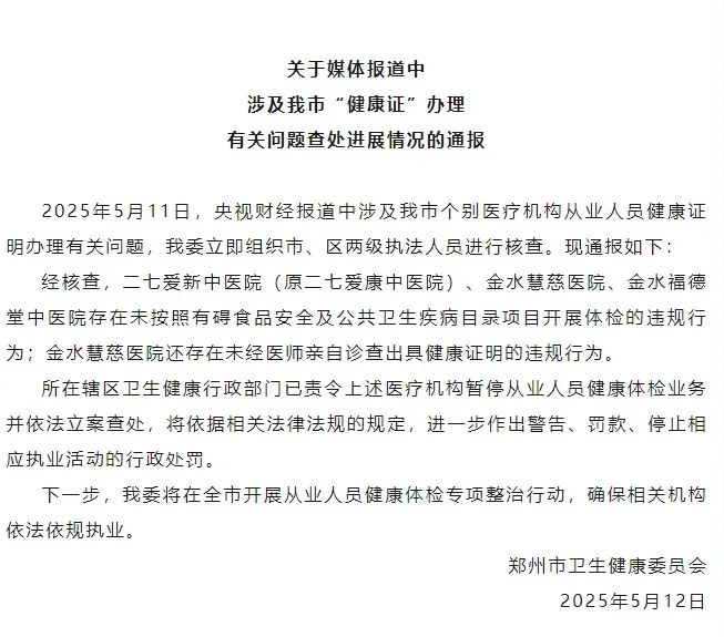 12日晚,郑州市卫健委发布“健康证”办理有关问题查处进展情况的通报。