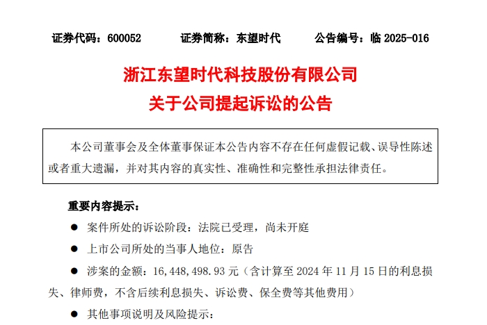 2月12日晚间,浙江东望时代科技股份有限公司(下称“东望时代”)发布公告,宣布因盈余分配纠纷,已向东阳市人民法院提起对浙江东阳农村商业银行股份有限公司的诉讼,涉案金额达1644.85万元。目前,该案件已被法院受理,尚未开庭审理。
