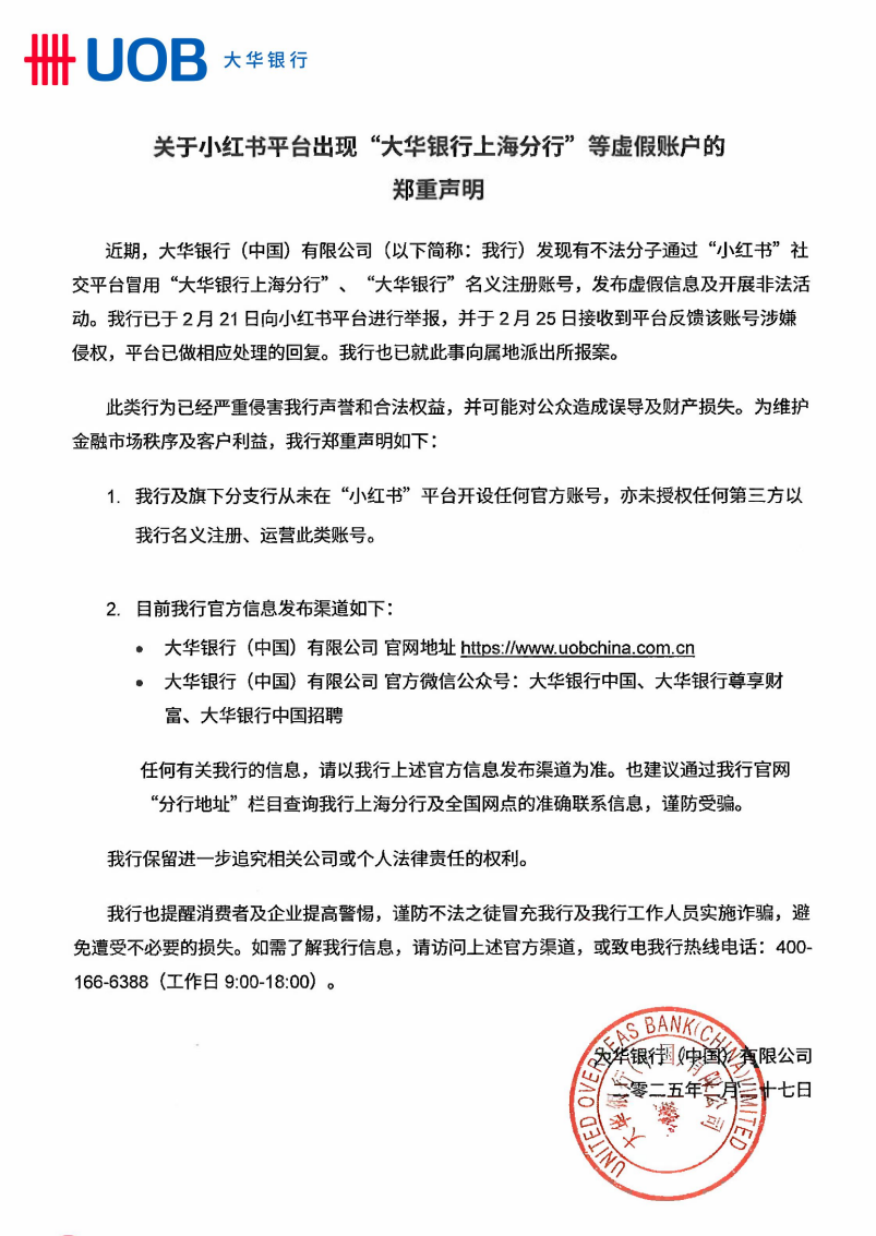 2月27日,大华银行(中国)发布声明称,近期发现不法分子在小红书平台冒用“大华银行上海分行”等名义注册虚假账号,发布误导性信息并开展非法活动。该行已于2月21日向平台举报,并于2月25日收到处理反馈,随后向属地派出所报案。