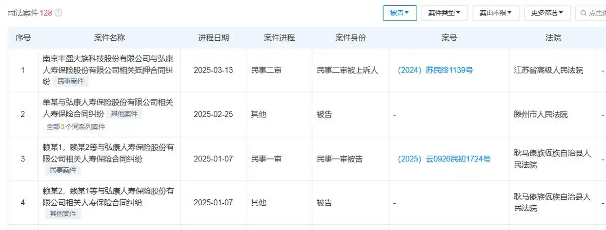 通过天眼查信息显示,3月13日,南京丰盛大族科技股份有限公司与弘康人寿保险股份有限公司(以下简称“弘康人寿”)相关抵押合同纠纷案件在江苏省高级人民法院开庭审理。2025年以来,弘康人寿以被告身份涉案4起,案由主要是人身保险合同纠纷和抵押合同纠纷,按遍及江苏、山东、云南。