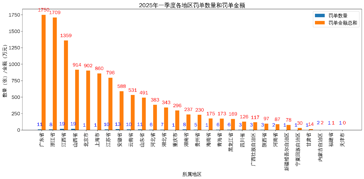 按地区累计罚款金额来看,广东省内农商银行以1750.00万元的累计罚款金额位居榜首;浙江省紧随其后,累计罚款1709.00万元;江西省内农商银行以1359.00万元的罚款金额排在第三位。此外,山西省和北京市的内农商银行累计罚款金额也较高,分别为914.33万元和902.27万元。